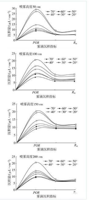 图5不同喷雾距离和叶倾角条件下的流失点(POR)和最大稳定持留量(Rm)