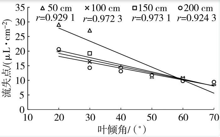 流失点是农药喷施量的关键决定参数,当农药喷施量超过流失点,会减少药液在叶片表面的持留量,降低药效且造成农药的浪费。图4表明,流失点与叶倾角呈显著负相关,且随着喷雾距离增加,斜率降低,说明叶倾角和喷雾距离对流失点均有显著影响。