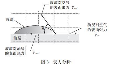 液滴爆炸现象的第二阶段边缘处的液滴产生液滴喷发现象,在该过程中液滴中部较厚的部分不断向边缘输送液体,因此会稳定持续一段时间。为解释这一阶段,先从表面张力入手,因为接触角的不同,水对油的表面张力大于乙醇对油的表面张力,则混合液体对油层的界面张力介于水和乙醇之间。混合液滴中乙醇的比例越大,混合液体对油层的界面张力越小,受到向内的张力减小,这样整体向外的张力增大,这是产生向外推动的驱动力的重要原因。可见界面张力直接决定了液滴在界面上的扩散和运动。
