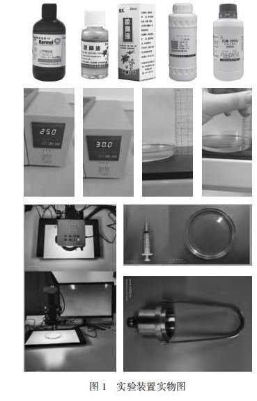 为了还原物理现象,初步探究液滴爆炸的原因,本文首先进行了预实验。实验中所用到的物品包括:医用75%酒精和蒸馏水混合形成水混合物液滴,家用菜籽油用作油池,普通蓝墨水染色。在室温环境下进行实验,预实验中发现普通蓝墨水染色现象不明显,改进为采用甲基蓝染色剂进行染色。正式实验时准备了不同种类的水混合物(乙醇、二乙二醇丁醚),不同种类的疏水性物质(硅油、花生油、蓖麻油),不同厚度的疏水性物质(5 mm、10 mm),设置合适的浓度梯度,采用恒温水浴锅来测定温度。在显微镜下观察液滴的运动过程,精准测定液滴大小,利用注射器定量控制滴入液滴的体积,再利用黏度计测量黏性系数,并对实验误差进行了修正。