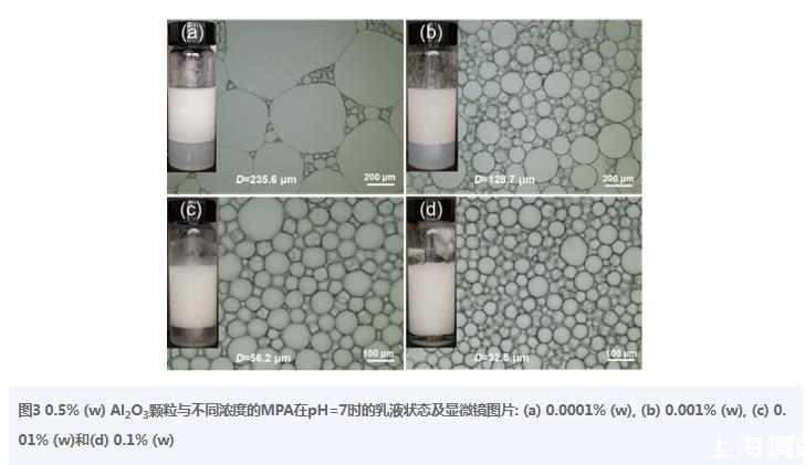 体系成份的浓度对乳液的外观及粒径有很大影响。图3为固定0.5%(w)Al2O3颗粒浓度不变,研究在pH=7时不同MPA浓度对Pickering乳液的影响。随着MPA浓度的不断增加【0.0001%——0.1%(w)】,乳液下层析出的水相逐渐变澄清,说明MPA浓度增加,更多的Al2O3颗粒与MPA分子发生静电相互作用,修饰后的Al2O3颗粒更容易从水相层中转移到乳化层中,吸附在油水界面处,并且乳化层的高度也随着MPA浓度的增加而升高,也说明更多的活性Al2O3颗粒参与乳化。乳液液滴粒径随浓度增加逐渐减小,从235.6μm降低到32.5μm,这是因为油水界面处的活性Al2O3颗粒的量逐渐增多,可以稳定更多的Pickering乳液液滴。