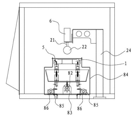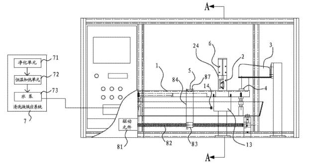 [0019]在一些实施方式中,清洗槽的底部凹设有容纳孔,容纳孔能够容纳板材样品插入到容纳孔中,容纳孔的底部设有排液阀,清洗液供应系统供应的清洗液通过管道传送到容纳孔中,清洗液从容纳孔当中漫出并流满整个清洗槽。其有益效果是,设置容纳孔后,可以方便样品完全没入到清洗液当中,这样清洗槽就只需要在容纳孔位置设置的较深,其它位置设置得较浅即可。否则的话如果需要让样品完全没入清洗液中,就需要将清洗槽整体设置成很深。设置排液阀后,可以很方便排干清洗槽中的清洗液。