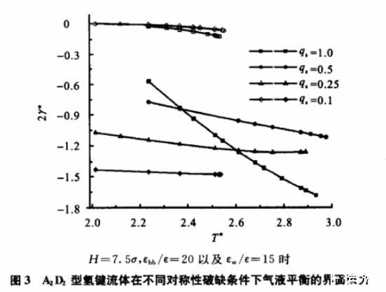 之前的研究表明,腔壁分子与流体分子的相互作用是影响受限空间流体相态特征的重要因素。本文考虑狭缝两侧分子与流体分子相互作用不同从而导致的体系对称性破缺,并用参数qs表示对称性破缺程度。为了考察对称性破缺对体系气液平衡界面张力的影响,在图3中给出了当H=7.5σ,εhb/ε=20,εw/ε=15时,A2D2型氢键流体的界面张力~温度曲线。