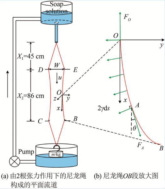 如图1(a)所示,配制的皂液盛于上水箱中,经一个狭长的出水管流出,进入一个由两根直径为0.32 mm的尼龙绳构成的竖直平面流道(实验中,尼龙绳一直处于下方砝码施加的张力作用下)。紧接出水管口的流道为渐扩的扩张段,其下为流道宽度不变的实验段和流道逐渐收窄的收缩段(在本文实验中,扩张段长度X1=45 cm;实验段长度X2=86 cm,实验段入口宽度W=5 cm)。在扩张段,皂液在重力驱动下加速,当重力和空气阻力平衡时充分发展,最终在实验段达到匀速运动,之后经收缩段流入下水箱,再被泵回至上水箱,形成往复循环。