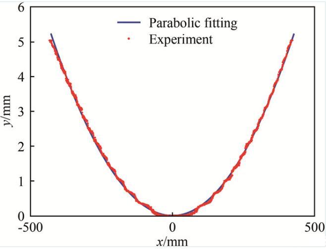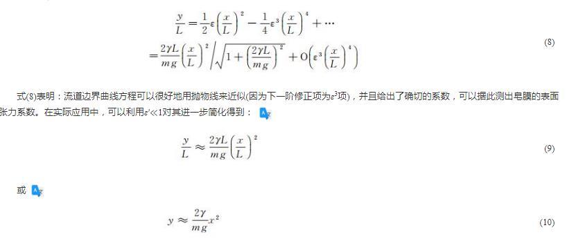 Sane等推导了表面张力系数与尼龙绳曲线方程的关系,但并未获得曲线方程的精确解,而是采用高阶多项式对实测曲线进行拟合,发现选取二阶多项式可以得到较好的结果,从而也获得了式(10),并通过拟合系数得到了表面张力系数。本文的严格推导说明:流道边界曲线是抛物线加上高两阶小量的修正。图(2)也证明了这一推导结论的正确性。