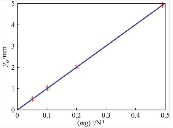 图3给出了在同一皂液流量Q=35 mL/min下测得的流道中点O的位移随砝码质量的变化以及根据式(11)拟合的直线。所有数据点都很好地落在过原点的拟合直线上,进一步验证了本文推导的正确性。根据直线斜率测得的表面张力系数γ=27.1 mN/m,与前述抛物线拟合法得到的结果相近。