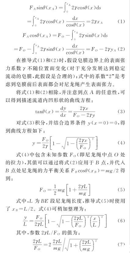 在推导式(1)和(2)时,假设皂膜边界上的表面张力系数γ不随位置而变化(对于充分发展达到稳定流动的皂膜,此假设是合理的);式中的系数“2”是考虑到皂膜前后表面都会对尼龙绳产生表面张力。