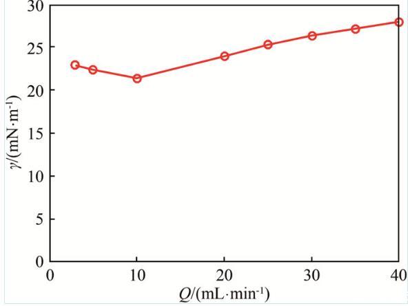 利用这一方法,还测量了表面张力系数随皂液流量的变化关系,如图4所示。图中曲线并非如部分文献报道的“表面张力系数随皂液流量增加而单调下降”,这可能是由于表面张力系数随皂膜厚度变化而有所变化、且实验中皂膜厚度并非均匀分布导致的。