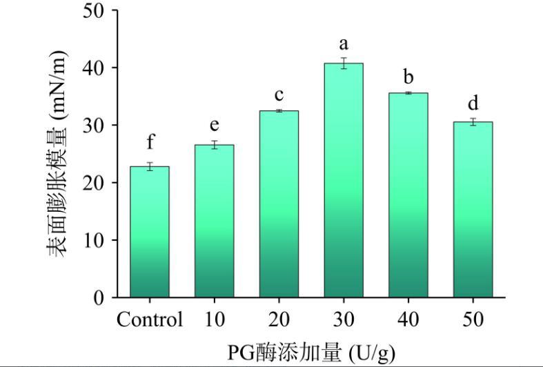 表面膨胀流变学是一个重要的表征,通过其可以确定吸附在气-水界面的蛋白质的相互作用。如图2所示,随着PG添加量的增大,脱酰胺玉米醇溶蛋白的表面膨胀模量呈现先增大后减小的趋势。当加酶量达到30 U/g时蛋白质的表面膨胀模量达到了最大40.74 mN/m。这可能是因为适度的脱酰胺,增强了蛋白质分子柔性,形成了致密的三维网状结构,疏水性基团暴露,蛋白质分子之间的相互作用加强,从而增强了蛋白质在吸附层薄膜的稳定性。当PG量继续增加时,蛋白质网络结构塌陷,重新形成了聚集体,疏水相互作用减弱使蛋白质界面膜的稳定性变差。