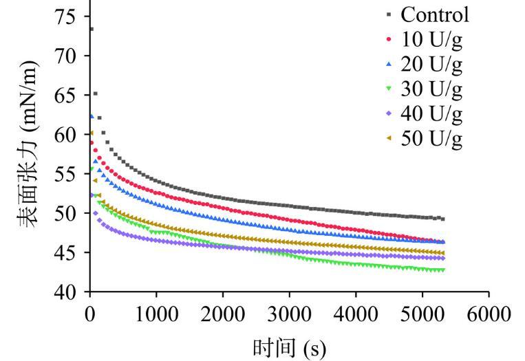 如图1所示,蛋白质动态表面张力的下降速率总体上呈现先上升后下降的趋势,平衡后的表面张力值呈现先下降后上升的趋势。当加酶量达到30 U/g时蛋白质的表面张力达到了最低,这是因为适度的脱酰胺增加了蛋白质的分子柔性,结构展开暴露出来更多的疏/亲水基团,更加有利于蛋白质在气-水界面的吸附,从而使蛋白质的表面张力降低。随着加酶量的增加,又形成了较大的聚集体,以及表面疏水性的降低也不利于蛋白质在界面上的吸附,从而导致表面张力的增加。蛋白质在气-水界面的表面张力对其起泡性质有着很大的影响,然而表面张力与起泡性质的总体变化趋势相似却并不完全一致,这说明表面张力并不是决定蛋白质起泡性质的唯一因素。任中阳等发现鲢鱼肌浆蛋白的起泡性与溶解度有直接关系;Johnson等研究发现蛋白质水解物聚集体的大小也会对其起泡性产生直接影响。