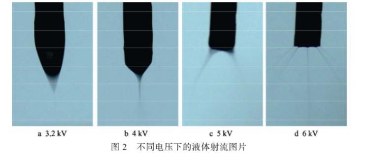 电压越高,液体雾化成的液滴越细小。随着电压的升高,液滴雾化的射流状态大致可以分为三种:滴状模式、锥射流模式和多股射流模式。在较小的电压(0~3 kV)下,喷嘴处液体所受的电场力小于表面张力,喷嘴中液体以滴状形态落下,为滴状模式。电场力逐渐增大,喷嘴液体被拉成细长轴状,形成连续的射流。进一步增大电压(如图2a、b所示),液体在喷嘴处形成锥状,且破碎成小雾滴,为锥射流模式,如图2b所示,射流状态最稳定。