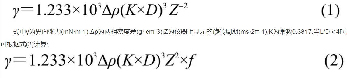 式中γ为界面张力(mN·m-1),Δρ为两相密度差(g·cm-3),Z为仪器上显示的旋转周期(ms·2π-1),K为常数0.3817.当L/D<4时,可根据式(2)计算: