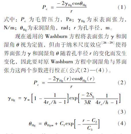 式中:Pc为毛管压力,Pa;γHg为汞表面张力,N/m;θHg为汞润湿角,rad;r为孔半径,m;γ∞为孔半径无穷大时汞的表面张力,γ∞=480 mN/m;θHg∞为孔半径无穷大时汞的润湿角(θHg∞=140°);Sb为吸附热,Sb=Eo/Tb=93.99 J/(mol·k),Eo为蒸发焓,Tb为沸点;R为理想气体常数,R=8.314 J/(mol·k);h为有效分子或原子直径,h=0.302 nm;rc为液滴曲率半径,rc=-r/cosθ,nm;常数C1、C2、C3分别为18.345、1.719、2.711 7。