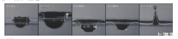 为了保证数值模拟结果的准确性,本文选择Morton的实验数据对数值模型进行验证,实验使用直径为2.9 mm的液滴撞击液池,弗劳德数及韦伯数分别为Fr=220,We=248.如图3所示,照片为高速摄影机摄得的实验过程,白色线条表示相同时间节点下的数值模拟结果,t为物理时间乘以Vi/D后的无量纲时间。液滴下落后冲击液池并产生了一个空腔,腔体在t=7.9时达到最大化。空腔塌陷后毛细波向中心处传递,并坍缩形成中心射流,使其高度不断增大,在射流顶端断裂生成二次液滴。由于实验环境的复杂性,模拟条件与实验条件无法完全一致,且本文采用轴对称模型假定进行模拟,无法捕捉非对称运动,因此模拟值与实验值存在一定差异。但数值模拟在界面变形、空腔的形成与成长、毛细波在空腔底部的传播等方面与实验值取得了良好的一致性,且在空腔形成过程中给出了较实验更加详尽的毛细波运动细节,中心射流最大高度以及空腔最大深度的误差分别为1.7%,2.6%,表明数值模拟能够较好地描述液滴撞击液池的运动。