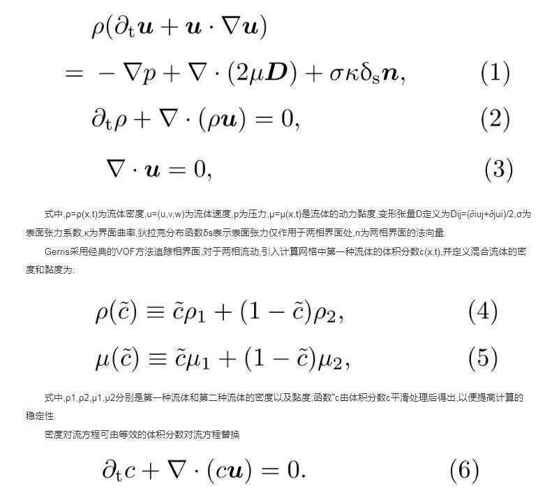 Gerris采用经典的VOF方法追踪相界面,对于两相流动,引入计算网格中第一种流体的体积分数c(x,t),并定义混合流体的密度和黏度为:
