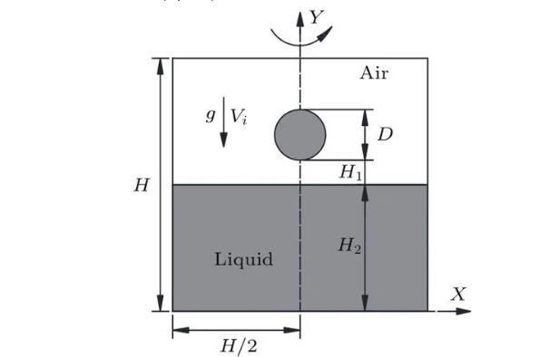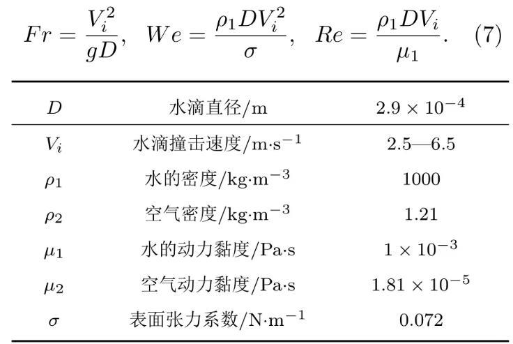 如图1所示,水滴撞击深水液池的数值模拟在轴对称坐标系中进行,Y轴为计算区域的对称轴,D为初始水滴直径,R=D/2,正方形计算区域的长度H=20D,水滴距离液面的距离H1=0.1D,液池深度H2=12D以消除底部对液滴撞击运动的影响,水滴在重力g和撞击速度Vi的作用下撞击液池。采用雷诺数、韦伯数和弗劳德数来描述液滴撞击的运动特征,三者分别表征液体惯性力与黏滞力间的关系、液体惯性力与表面张力间的关系以及液体惯性力与重力间的关系。三个无量纲参数的表达式如(7)式所示,主要物理参数如表1所列。