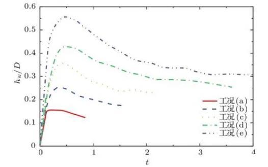 图7及图8分别为不同工况下波浪隆起高度hw和空腔宽度r随时间的变化过程。由图7易得,水滴撞击水池后波浪高度的变化过程也经历了从快速增长到逐渐回落,最终在惯性力的作用下自主运动,趋于稳定的过程。随着弗劳德数的增大,更大的垂向速度在创造更深空腔的同时激发了更高的最大波浪隆起高度。从图8可以看出,空腔宽度的增长与波浪的运动息息相关,在撞击产生的动能与波浪自身重力势能基本耗散后,空腔运动主要由毛细波及其干扰驱动,最后在惯性下线性增长。毛细波现象在图8工况(e)的t=0.8时非常显著,其周期在图6的t=1.5—2.5中也有体现。