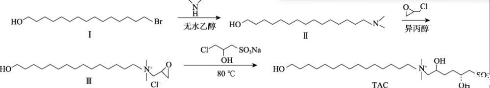 本文拟以15-溴-1-十五醇、二甲胺水溶液、环氧氯丙烷、3-氯-2-羟基丙磺酸钠为原料,通过季铵化反应和开环反应制备了甜菜碱表面活性剂(TAC)。通过聚合物和表面活性剂分子的疏水单元组成的混合胶束与聚合物主链发生物理交联,从而产生扩展的聚合物网络,以期改善稠化酸的耐温、耐剪切性能,提高180℃高温地层的油气采收率。