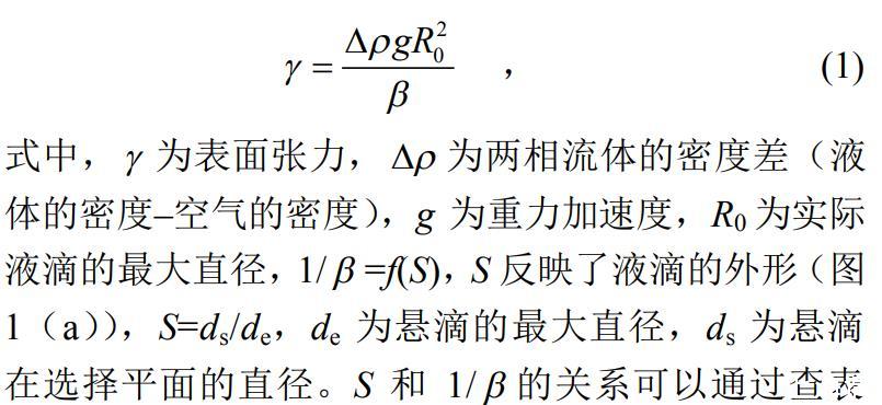 试验为比较3种液体表面张力的大小,采用悬滴法对液体的表面张力进行测量,悬滴法的基本原理是:处于毛细管端液体悬滴的形状与液体的表面张力有关,在重力作用下,毛细管端形成的球形液滴的形变,随着液滴有效密度的增加而增加并随着液滴界面张力的增加而减小。通过Young–Laplace方程可以推导得到悬滴法计算表面张力的基本方程: