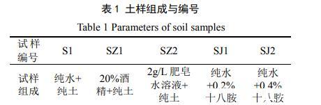 试验用土取自云南省境内昆曲高速公路严家山段,为浅灰色弱膨胀土,其自由膨胀率为55.7%,液限为41%,塑限为20.3%。取回的土样经过风干、碾碎后过2 mm的筛备用。为研究气–液界面张力对膨胀土干缩开裂的影响,采用3种不同表面张力的液体作为土中的液相,分别为:纯水、体积百分数为20%的酒精溶液和含量为2 g/L的肥皂水;通过在土体中混合斥水剂的方法配制不同接触角的土样,斥水剂十八烷基伯胺(C18H39N),简称:十八胺,为碱性白色蜡状粉末,纯度为99%,配制两种斥水土样,十八胺含量分别为:0.2%和0.4%。各土样的成分和编号如表1所示。