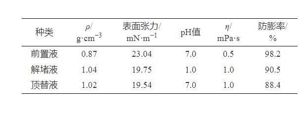 表3为解堵液体系的基本性能评价结果,可以看出,解堵液体系的黏度值和pH值较低,并且具有较低的表面张力,有利于注入和返排。另外,体系具有良好的防膨效果,能够防止黏土矿物的水化膨胀。