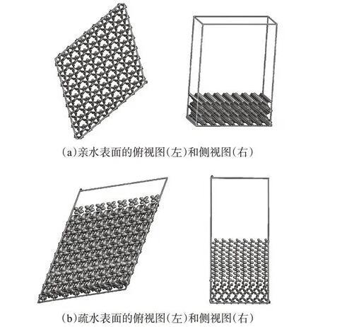 SiO2(001)元胞表面羟基化后,用十八烷基三氯硅烷(OTS)取代羟基进行硅烷化处理,并通过构建超胞得到扩展表面。为消除周期边界条件的影响,在表面添加35Å真空层,得到SiO2疏水表面初始模型。优化后的疏水表面结构如图1(b)所示,OTS的长链烷基在表面呈轻微倾斜的垂直规律排布。