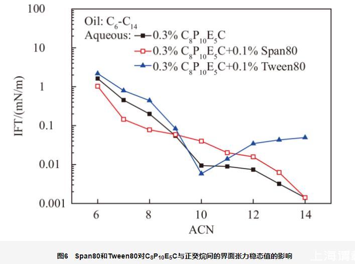 由于微胶囊靶向增黏聚合物是以非离子表面活性剂Span80和Tween80为乳化剂制备的,因此,以C8P10E5C为例,分别考察了0.1%的Span80和Tween80对0.3%C8P10E5C溶液与系列正构烷烃间界面张力稳态值的影响,结果如图6所示。