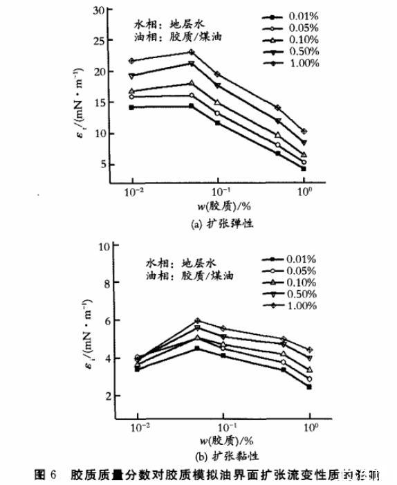 扩张频率对不同质量分数胶质模拟油的界面扩张弹性和黏性的影响见图4。从图4中可以看出,随着频率降低,总体上扩张弹性和黏性均逐渐减小,说明胶质在油水界面形成的是黏弹膜。当界面变形速度较慢时,各种弛豫过程有足够的时间去修复由界面面积变化带来的界面张力梯度,因而扩张弹性和黏性均随频率的降低而减小。
