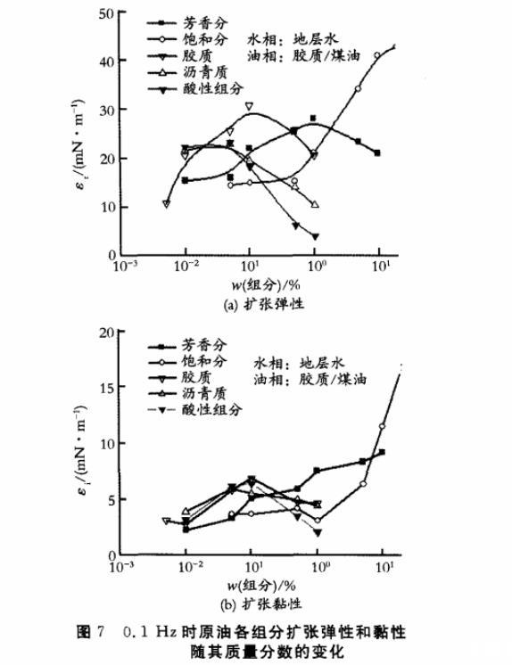 (3)各活性组分的扩张弹性均随质量分数通过一个最大值,其高低顺序为:饱和分>芳香分≈沥青质>胶质≈酸性组分。其中饱和分蜡组分在高浓度时以蜡晶形式析出,增强界面膜强度。