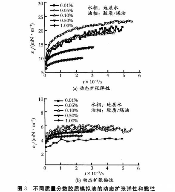 从图3(a)中可以看出,在实验初期,胶质分子在界面的吸附较少,膜内分子间相互作用较弱,扩张弹性较低;随界面老化时间增加,活性分子在界面上富集,界面吸附膜排列更加紧密,膜内分子间作用力增强,弹性也随之明显增大;当界面吸附接近平衡时,弹性也接近其平台值。对比图1和图3(a)可知,不同质量分数胶质动态界面扩张弹性与动态界面张力随时间变化的趋势基本上是一致的。
