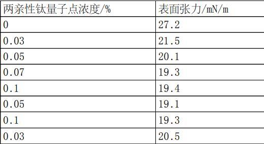 从表1中数据可以看出,添加两亲性钛量子点后液体表面张力显著降低,与不添加两亲性钛量子点相比,实施例3中两亲性钛量子点的加量达到0.07%时,表面张力由27.2mN/m降低到19.3mN/m,可见,两亲性钛量子点能协同表面活性剂发挥优良的解水锁作用。