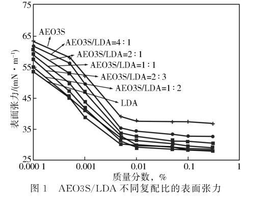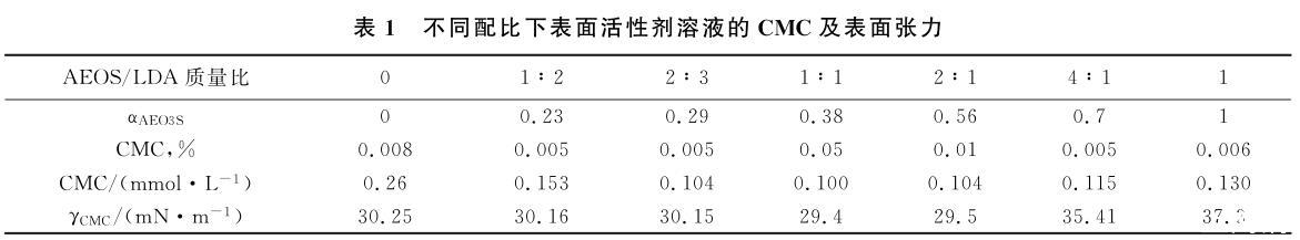 在25℃测试了AEO3S和烷醇酰胺LDA表面活性剂及其在不同质量配比下溶液的表面张力,实验结果见图1。根据相对分子质量计算出表面活性剂AEO3S的摩尔分数(αAEO3S)。由图1中浓度与表面张力的关系得到溶液的CMC及对应浓度下的表面张力,实验结果见表1。