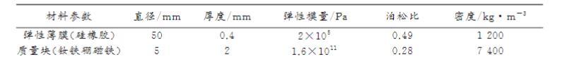 研究对象MAMs结构:弹性薄膜中心两面粘结圆形质量块。薄膜采用硅橡胶,通过匀胶机制备:按硅胶与固化剂100:3比例混合,低速档(500 rpm,30s)甩开胶液,高速档(1000 rpm,30s)均匀涂布于硫酸纸基底,静置30min后剥离得到。高速档转速不同会导致薄膜厚度不同(如表1不同转速所得薄膜厚度,具体值因排版缺失未完整显示)。实验中,薄膜制备厚度为0.4 mm。质量块采用钕铁硼磁铁。材料参数详见表2。