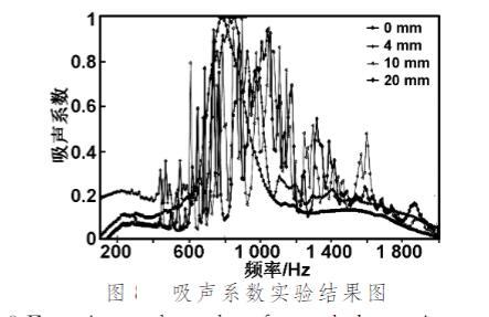 使用10mm后腔,半径30mm的弹性薄膜分别施加0 mm,4 mm,10 mm,20 mm的拉伸(以改变表面张力),并在薄膜中心粘结直径5mm、厚度2mm的质量块。测量吸声系数。