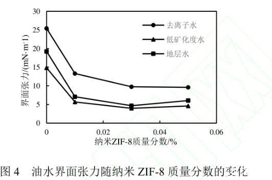 纳米ZIF-8流体的稳定性是评价其能否作为驱油剂的重要性质之一。将装有不同浓度纳米流体的样品瓶静置15 d后,当ZIF-8的质量分数为0.01%、0.03%时,纳米颗粒在不同矿化度的流体中均保持稳定状态,无沉淀生成,说明适当浓度的纳米ZIF-8颗粒在水中有着良好的稳定性。当ZIF-8的质量分数为0.05%时,静置后的纳米流体产生了少量沉淀,表明过高浓度的ZIF-8会互相聚结,导致颗粒变大,进而发生聚沉。