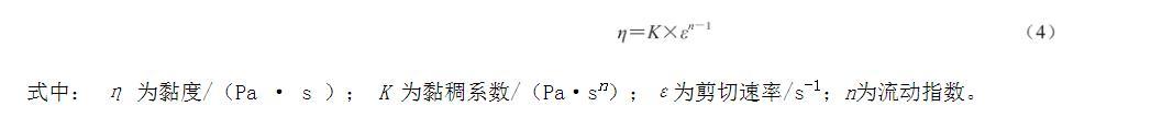 式中:η为黏度/(Pa·s);K为黏稠系数/(Pa·sn);ε为剪切速率/s-1;n为流动指数。