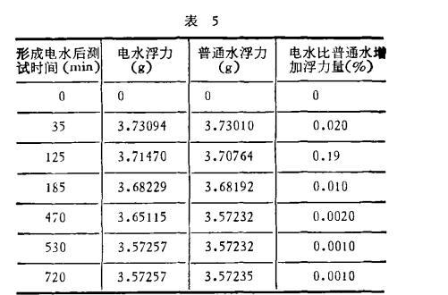 至于电水时间效应的机理问题,特别是浮力变化大的范围和缓慢变化范围和水分子及水中杂质储能的时间长短有何关系,还需要从实验和理论上进一步研究。