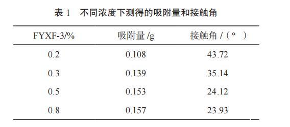 水与韩城煤粉的接触角为73.23°。在不同浓度下测悬浮剂吸附量和接触角,结果见表1。由表1可以看出,添加FYXF-3后,能大幅度地降低接触角,接触角随着FYXF-3浓度的增大而减小,浓度大于0.5%后,减小幅度变小;吸附量随着浓度的增大而增大,浓度大于0.5%后,增大的幅度变小。这说明FYXF-3浓度不小于0.5%时,能较大地增加吸附量、减小接触角,从而能有效改善煤粉表面的润湿性能,防止分散的煤粉结块而产生沉降,这样有利于悬浮煤粉并将其返排。