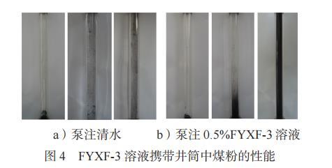 由图4a)看出,装有清水的有机玻璃管底部的煤粉没有被悬浮,且泵注后,排出液中几乎没有携带出煤粉。由图4b)看出,装有0.5%FYXF-3溶液的有机玻璃管底部的煤粉被悬浮,且泵注后,排出液为黑色浑浊液体,携带出煤粉质量为0.25g。可以看出,浓度为0.5%的FYXF-3溶液对煤粉的悬浮性能较好,可以将井筒堆积的韩城现场煤粉悬浮,并随着返排液返排至地面。