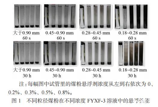 粒径方面,粒径大于0.90mm、0.45~0.90mm的煤粉悬浮效果较差,粒径为0.28~0.45mm的煤粉效果显著且没有明显分层现象;浓度方面,FYXF-3浓度越大,悬浮效果越好,浓度不小于0.3%后,悬浮效果显著。