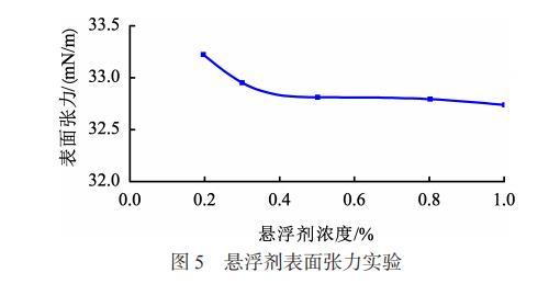 清水的表面张力为69.748mN/m,不同浓度悬浮剂溶液的表面张力值见图5。