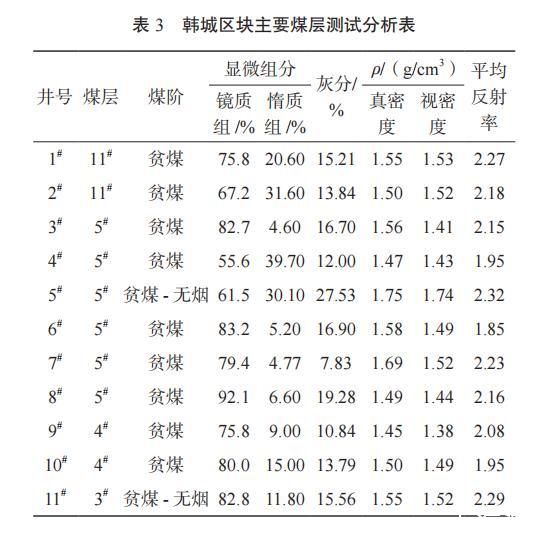 对表3综合分析可得,韩城主要目的煤层以贫煤和贫煤-无烟煤为主,属于中高阶煤,含气量较高;相同的演化条件下,惰质组产气率最低,镜质组产气率是惰质组的4.3倍。说明韩城区块镜质组的含量相对比较高,含气量较好,通过合理压裂改造能获得较好的产能;各井组的同一层系间差异较大,韩城区块煤层的非均质性非常强。