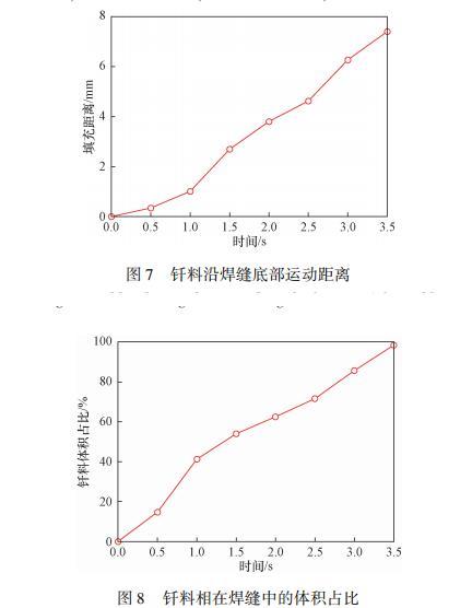 液态钎料沿着焊缝下表面的填充距离如图7所示。前1s内,钎料未润湿焊缝下表面,曲线上表示为钎料竖直向下运动的距离,此时铺展速度较为缓慢。当钎料直接接触焊缝下表面时,驱动力增强,加速了钎料的铺展。焊接过程中可能会出现微小气泡从而影响焊接强度,故统计了焊缝内不同时刻下钎料体积占总体积的比值(图8)。在t=1s之前,前沿流动速度较小,但由于填充截面面积较大,总体铺展速度仍处于较高的水平。当钎料开始向两侧流动,铺展速度略微下降。最终得到的钎料填充体积占比达到98.5%,表明焊缝填充效果良好。
