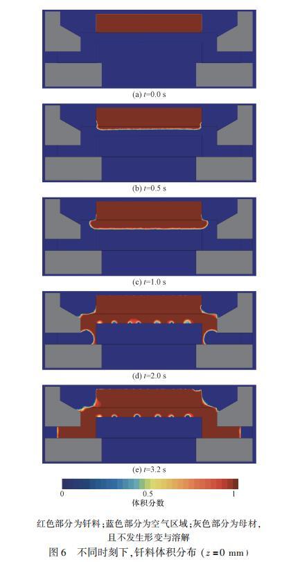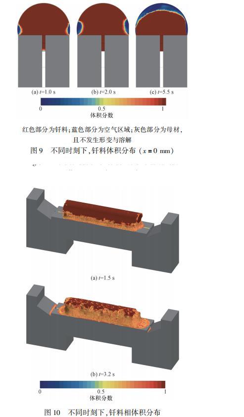 整个计算过程内的两相体积分布如图6所示。根据图6可以看出焊缝内不同时刻下的钎料运动状态。固态钎料温度缓慢上升,当底部钎料达到熔点后开始融化,出现自由液面。钎料在表面张力和重力的作用下流入焊缝,整齐向下方流动,铺展过程较为缓慢。t=1.0s时,液态钎料开始沿着焊缝通道向两侧运动,由于计算模型的限制,部分气体未及时排出,在壁面上黏附形成许多虚假小气泡。t=2.0s时,由于毛细力的作用,壁面附近的钎料运动快于中心位置,由此形成了“凹”形的流动前沿。当t=3.2s时,焊缝被钎料完全填充,流场达到稳定状态,但焊缝上方表面的两个角点直接暴露在空气中,故该位置处的钎料填充效果略差。