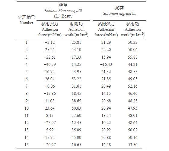 表4 15种处理作用于靶标作物时的黏附张力和黏附功