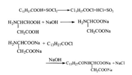 前两步反应为中间体的制备,最后一步为最终产物的制备。该反应属于SN2取代反应,在发生酰胺化反应的同时,十四酰氯很容易水解,十四酰氯与天冬氨酸钠也容易发生成酐反应,这是此反应的副反应。