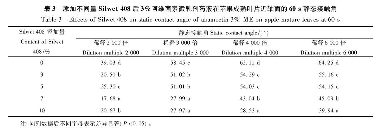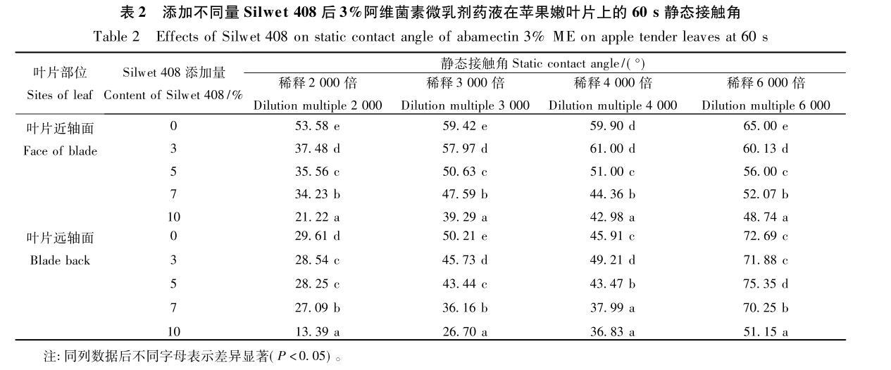 本研究表明,3%阿维菌素微乳剂中添加Silwet 408可显著降低药液表面张力及其在苹果叶片上的接触角,且表面张力和接触角的变化与助剂添加量和叶片的状态相关。因此在实际生产中,应根据害虫为害的部位及叶片状态等,有针对性地选择适宜的表面活性剂及其添加量。