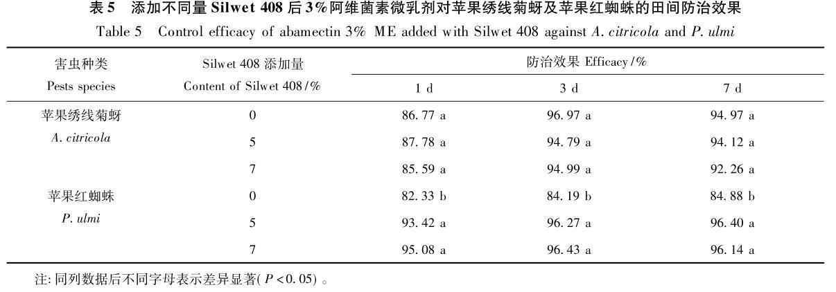 综合表面张力、接触角及室内毒力测定结果,选择Silwet408添加量分别为5%和7%的阿维菌素微乳剂药液进行了田间防效试验。结果(表5)与室内毒力试验结果规律基本一致:添加Silwet408对提高阿维菌素微乳剂对苹果红蜘蛛田间防治效果作用显著,而对苹果绣线菊蚜防效的影响则不明显,再次证明Silwet408虽可有效降低阿维菌素微乳剂的表面张力和接触角,但却未必一定能提高其对不同害虫的防效。