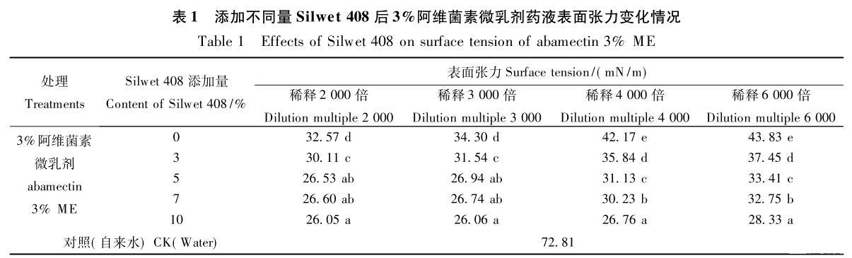 2.1添加不同量Silwet 408对阿维菌素微乳剂药液表面张力的影响