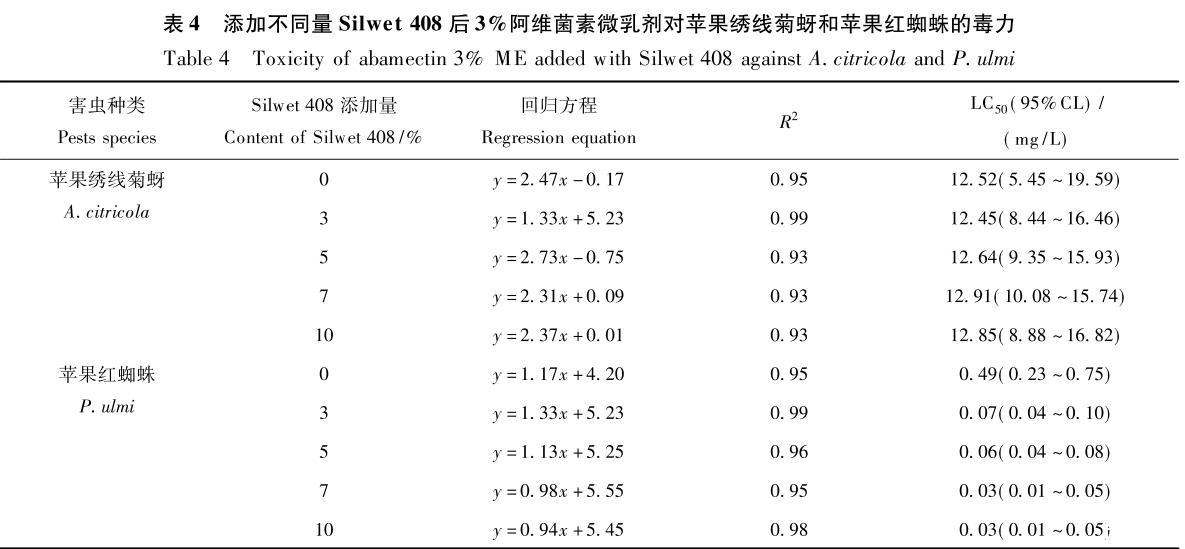 从表4中数据可看出:添加Silwet408可明显提高阿维菌素微乳剂对苹果红蜘蛛的毒力,且随助剂添加量的增加,药剂LC50值降低;但添加Silwet408对阿维菌素微乳剂对苹果绣线菊蚜的毒力并无明显影响。说明Silwet408虽能降低药液的表面张力及在靶标叶面的接触角,促进药液在叶片上的润湿性,但并不一定能提高其对害虫的毒力。